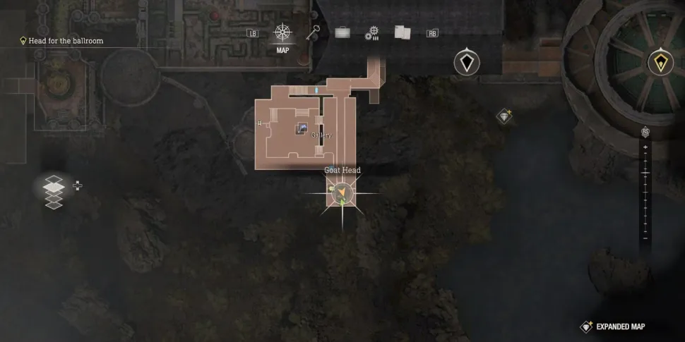 Поднимитесь наверх и пройдите через правую дверь в галерею, где игроки могут найти статую с головой козла в конце моста. Однако, когда игрок пройдет половину пути, враг потянет за рычаг, опускающий мост на уровень первого этажа, где на него нападут группы.