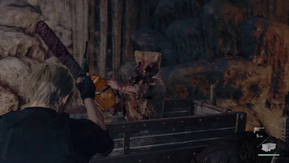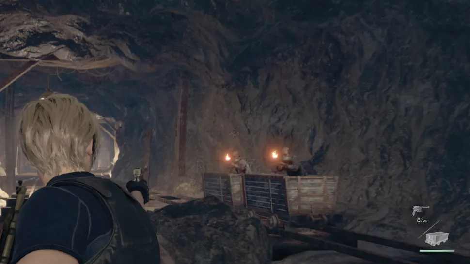 Конкретный участок, о котором идет речь, появится после того, как игроки вместе с Луисом победят двух боссов Gigante. После того как бой с боссом закончится, поднимите Луиса по стене, чтобы открыть запертые ворота, и продолжайте путь. В конце концов, игроки доберутся до участка с вагонетками, где Леон благоразумно поделится некоторыми опасениями по поводу этого вида транспорта.