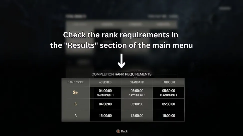 За исключением ранга S+ в профессиональном режиме, все ранги в RE4 определяются временем игры. Например, на сложности Assisted прохождение игры менее чем за 15 часов дает игроку ранг A; прохождение игры за 4 часа на NG+ дает ранг S; а прохождение игры за 4 часа на New Game дает ранг S+.