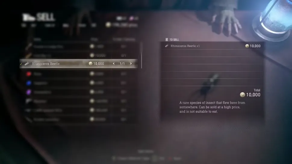 Перед продажей жуков экипируйте амулет "Жук-носорог", чтобы удвоить их цену. И не ешьте их, потому что там уже есть много желтых трав, чтобы увеличить запас здоровья Леона.