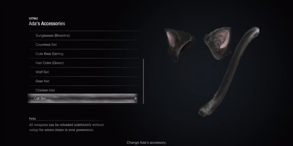 После того как Ада наденет "Кошачьи ушки и хвост", все оружие в ее инвентаре получит бесконечные патроны. Однако это не коснется ракетницы, и игрокам все равно придется покупать бесконечные патроны для RPG за 1 500 000 песет в Новой игре плюс.