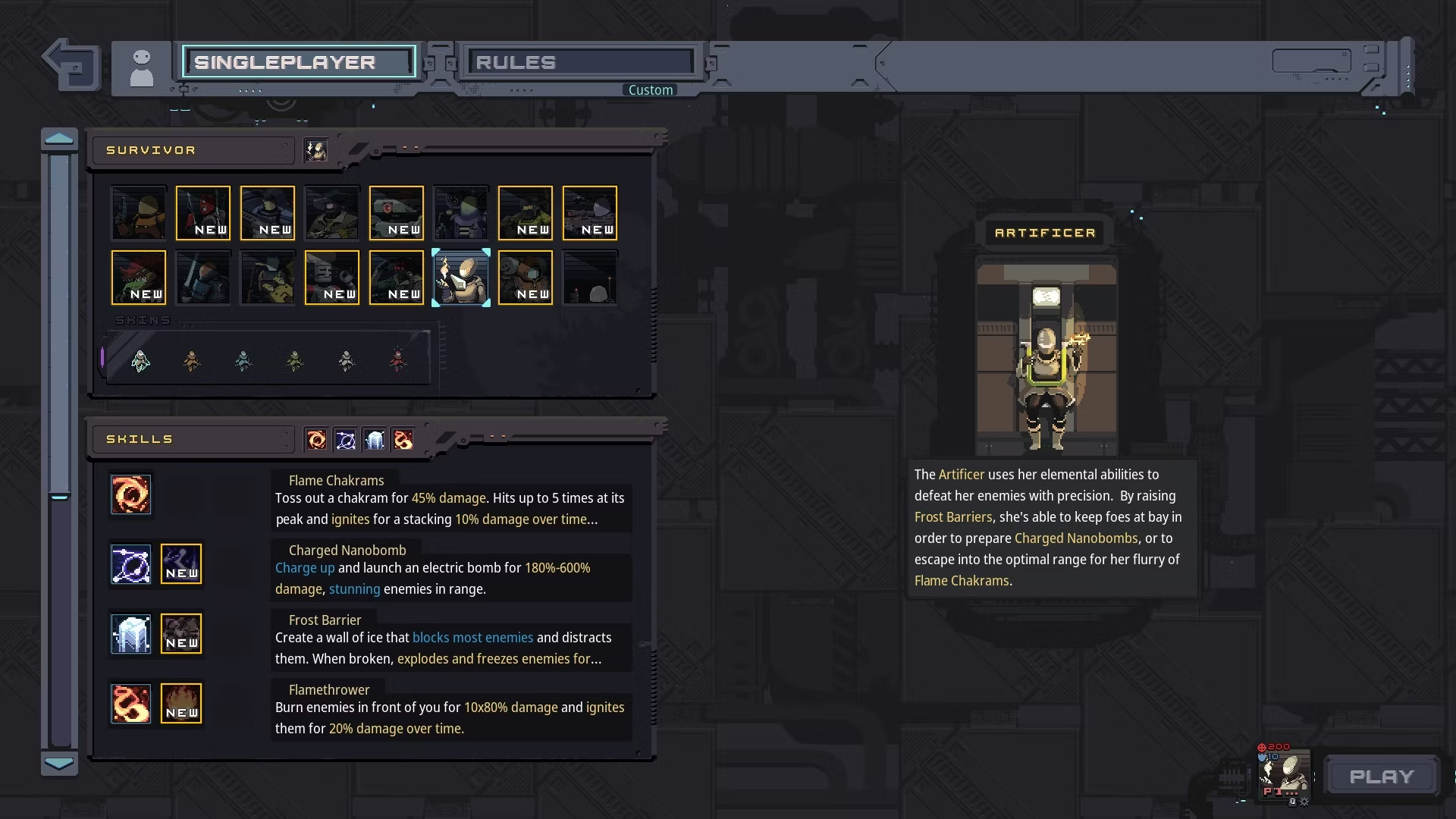Artificer регрессирует из Risk of Rain 2 и дебютирует в качестве 2D-персонажа. Чтобы получить ее, игрокам необходимо пройти каждую карту в игре хотя бы один раз. В каждом забеге шесть этапов, и на первых пяти этапах есть две карты. Игра случайным образом решает, какую карту игрок получит во время прохождения. Опять же, просто продолжайте играть, и в конце концов Artificer будет разблокирована.