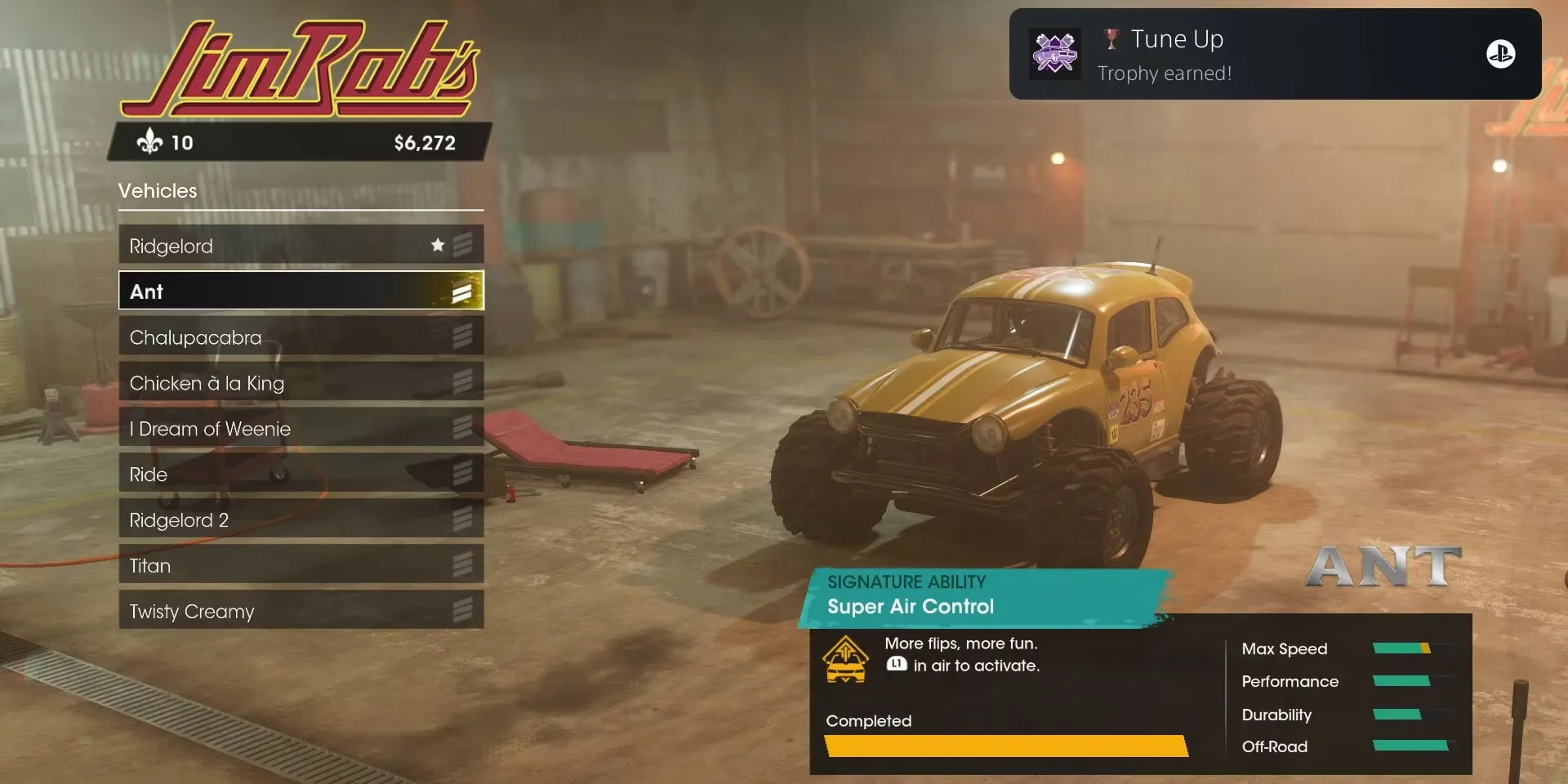 После выполнения двух двойных сальто назад игроки получат сообщение на экране о том, что способность Super Air Control Signature разблокирована. Однако прежде чем воспользоваться ею, нужно будет отправиться в гараж Джима Роба, чтобы активировать ее. Пока они там, они могут подумать о том, чтобы добавить к Ant комплект закиси азота, если они этого еще не сделали. Установка одного или двух комплектов модернизации также может помочь, хотя и не так сильно, как комплекты Nitrous и Offroad.