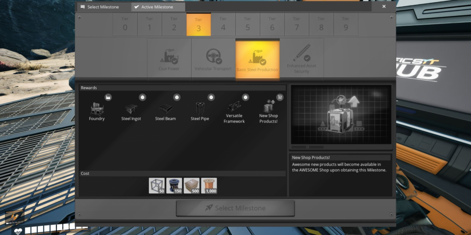 Производство стали в Удовлетворительном состоянии можно разблокировать, пройдя этап «Базовое производство стали» на третьем уровне модернизации терминала HUB. Здесь также можно разблокировать стальные балки, стальные трубы и стальные слитки. Для выполнения этого этапа необходимы следующие материалы: