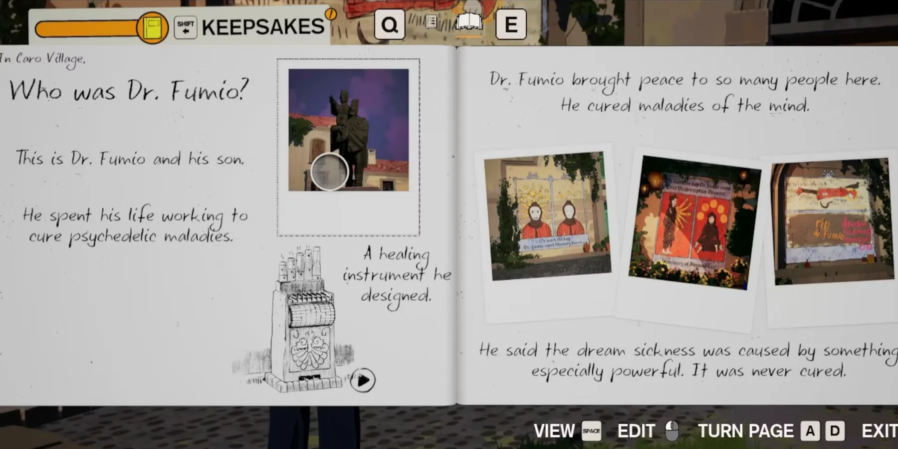 В процессе работы она обнаруживает, что хочет создать воспоминание о докторе Фумио, враче, который лечил пациентов с болезнью разума. Чтобы заполнить страницу, Эстель понадобится фотография статуи Доктора, изображение музыкального инструмента, который он создал, и три фрески, рассказывающие историю Доктора, спрятанные вокруг площади в этой красивой, похожей на арт инди-игре.