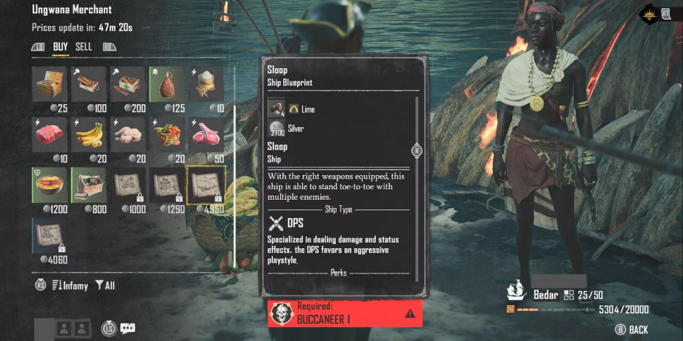 Когда вы доберетесь до Затонувшей заставы, поговорите с торговцем Унгваной, стоящим на пляже сразу слева от вас, чтобы посмотреть товары на продажу, в том числе чертеж шлюпа, который стоит 4 950 серебра. Однако, чтобы купить чертеж шлюпа, вам также потребуется быстро повысить свой уровень Бесчестья в "Skull and Bones", так как для его покупки также требуется ранг 1. После того как вы принесете чертеж, вам понадобятся следующие ресурсы, чтобы построить шлюп у корабельщика: