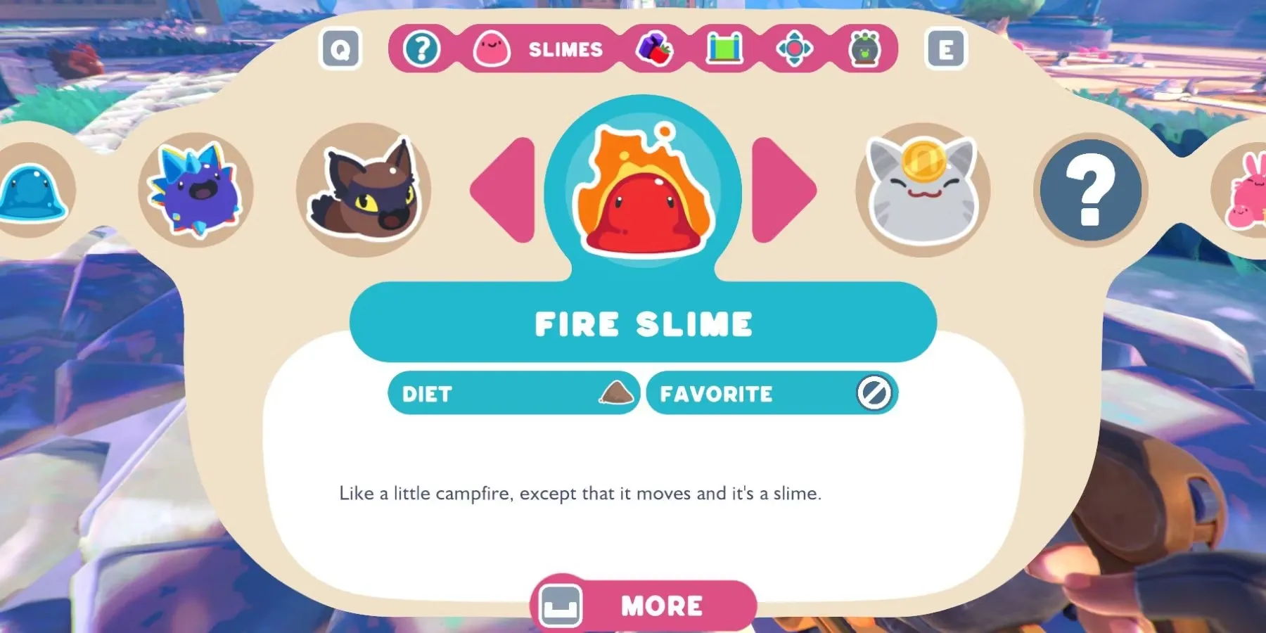 В Slime Rancher 2 игроки попадают на Радужный остров, большой райский уголок, наполненный слизью, с новыми достопримечательностями и предметами для знакомства. Стандартным игровым аспектом является кормление слизней, которых они содержат на своем ранчо. Многие из них едят обычные продукты, такие как овощи, растения или мясо, но некоторые хотят менее традиционных блюд, например, пепел. Пепел не встречается случайно, как другие ресурсы, и игрокам придется добывать его самостоятельно.