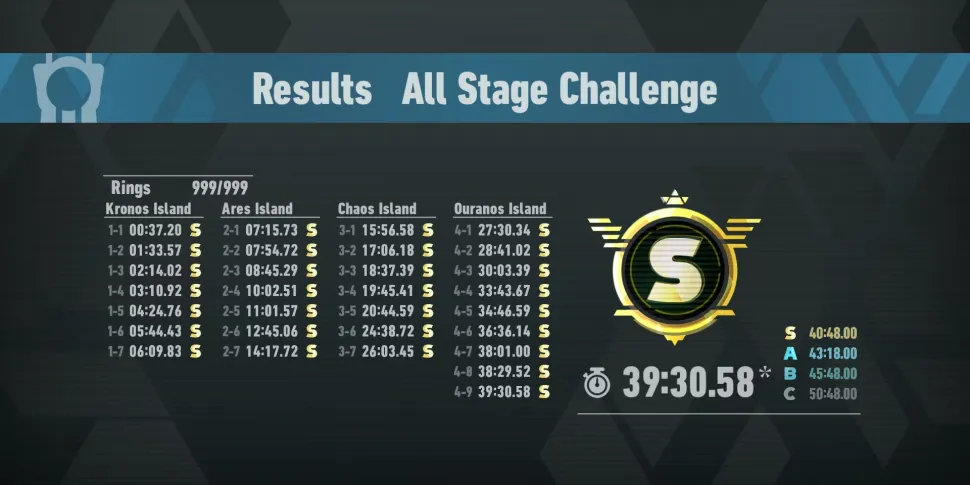 Хотя сам режим можно легко завершить с любым рангом, игра просит игроков пройти его на скорость. Закончить его с рангом S гораздо сложнее, особенно в заданиях Киберпространства на острове Кронос. Самым полезным приемом, который нужно выучить и освоить, будет Homing Dash, который выполняется путем наведения на врага и быстрого ускорения перед тем, как Соник ударит его. Конечно, при этом на итоговом времени любой миссии в Киберпространстве будет стоять звездочка, но эта звездочка не влияет на игровой процесс и лишь указывает на то, что для достижения этого времени использовался Homing Dash.