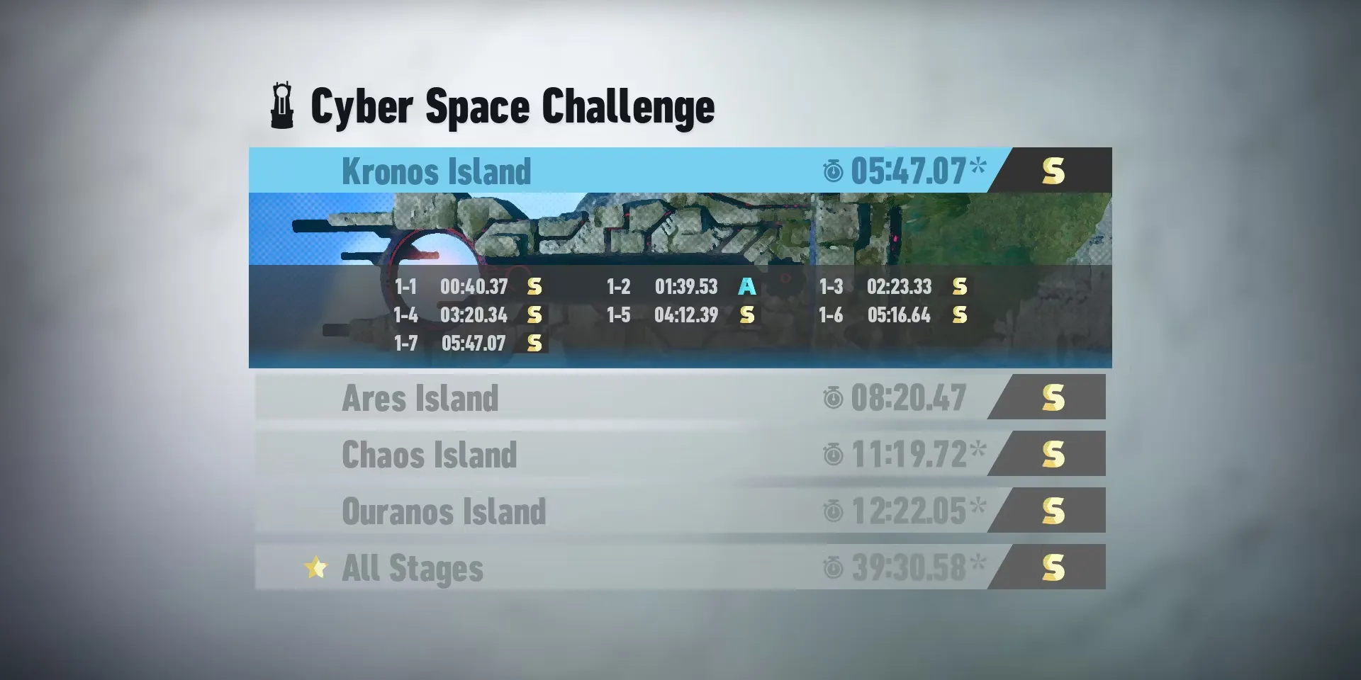 Если игрок будет стараться избегать врагов и использовать Homing Dash, Drop Dash и Rail Launch, то, несомненно, удастся достичь уровня ниже S (или даже ниже). Это приводит к последнему испытанию: игрок должен пройти все четыре острова уровней Киберпространства без сохранений. Это испытание можно преодолеть, используя все приемы, и, к счастью, очень сложный уровень в 1-2 находится в самом начале этой связки, а значит, его легко перезапустить, если во время него была допущена ошибка.
