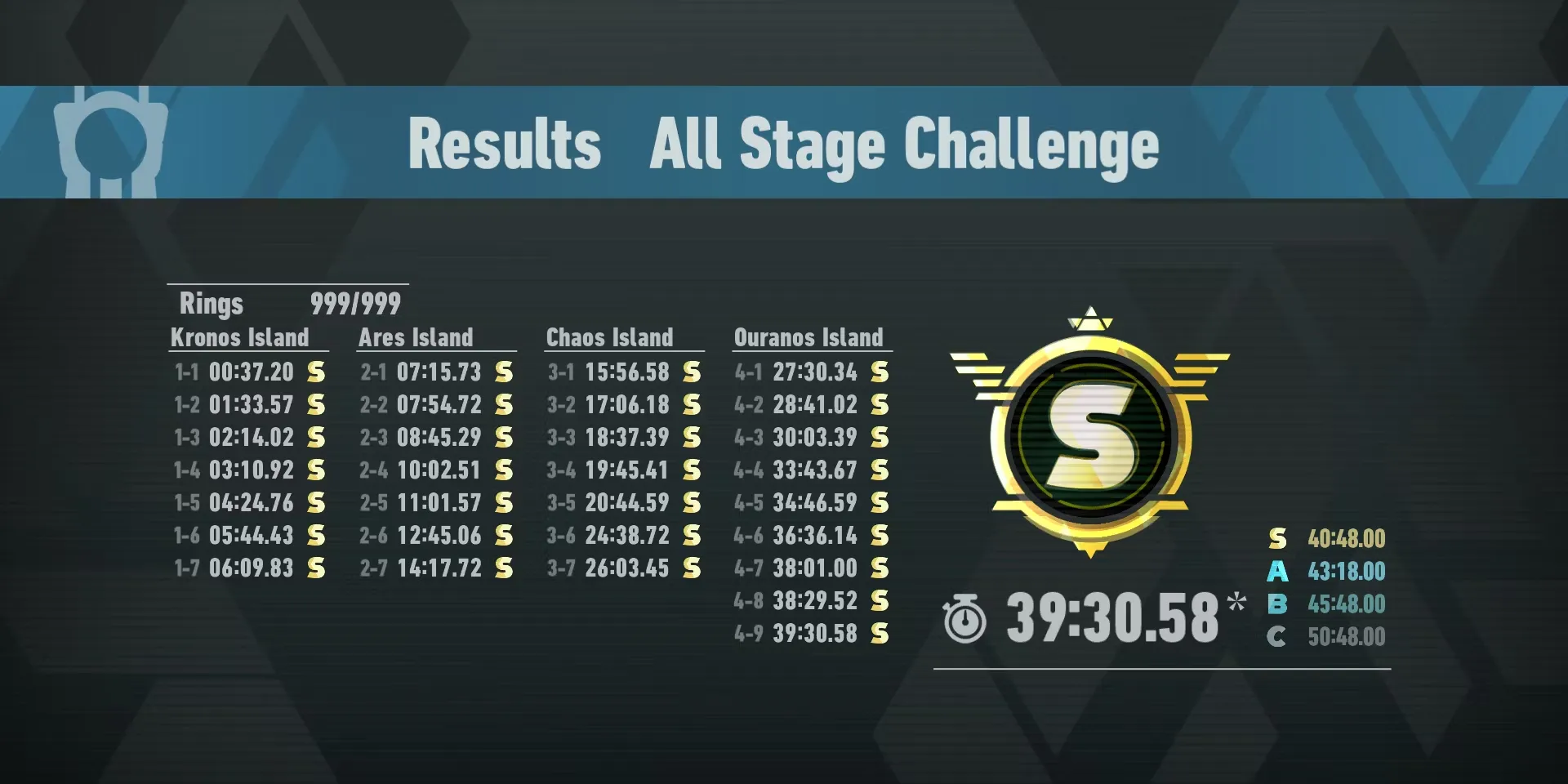 Хотя сам режим можно легко завершить с любым рангом, игра просит игроков пройти его на скорость. Закончить его с рангом S гораздо сложнее, особенно в заданиях Киберпространства на острове Кронос. Самым полезным приемом, который нужно выучить и освоить, будет Homing Dash, который выполняется путем наведения на врага и быстрого ускорения перед тем, как Соник ударит его. Конечно, при этом на итоговом времени любой миссии в Киберпространстве будет стоять звездочка, но эта звездочка не влияет на игровой процесс и лишь указывает на то, что для достижения этого времени использовался Homing Dash.