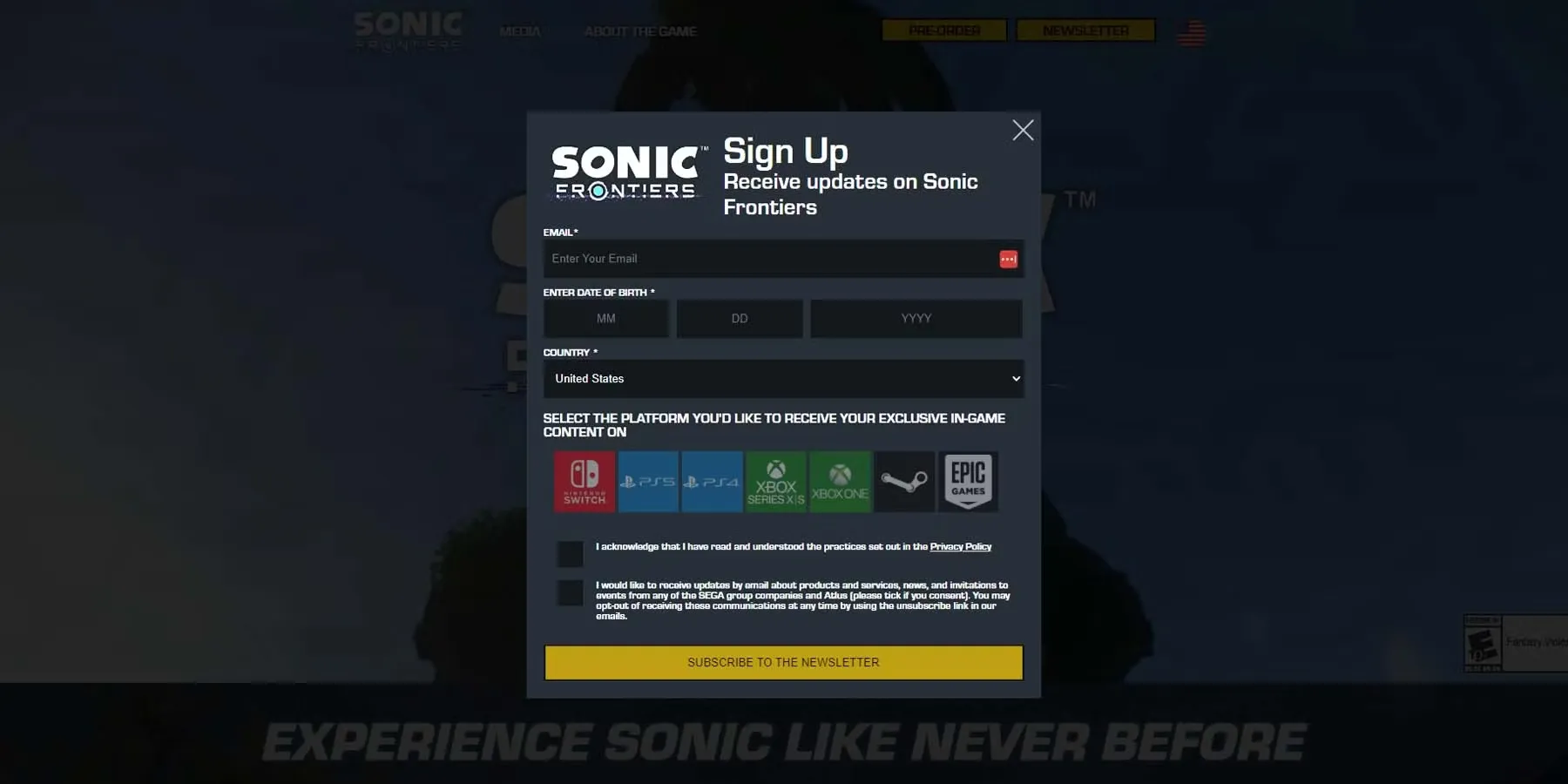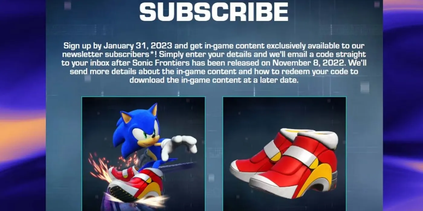 Те, кто хочет вновь ощутить ностальгию по Sonic Adventure 2, должны обязательно разблокировать SOAP Shoes. К счастью, эти ботинки можно получить бесплатно, и для этого не нужно заказывать специальное издание игры или оформлять предварительный заказ. Вместо этого игрокам нужно просто подписаться на рассылку новостей Sonic Frontiers, нажав на соответствующую кнопку в правом верхнем углу главной страницы игры. Игроки могут быстро перейти на страницу, нажав на эту ссылку. После нажатия на кнопку "Информационный бюллетень" появится небольшое всплывающее окно, в котором игрокам будет предложено ввести некоторую информацию.