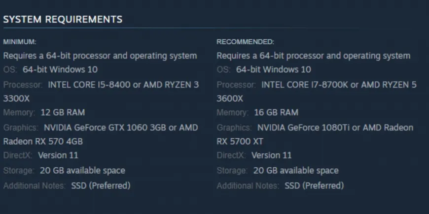 Системные требования для Sons of the Forest указаны на сайте Steam. Игрокам потребуется процессор Intel Core I5-8400 или AMD RYZEN 3 3300X в качестве минимального, но рекомендуется Intel Core I7-8700K или AMD RYZEN 5 3600X для наиболее плавной работы. Кроме того, 16 ГБ оперативной памяти.