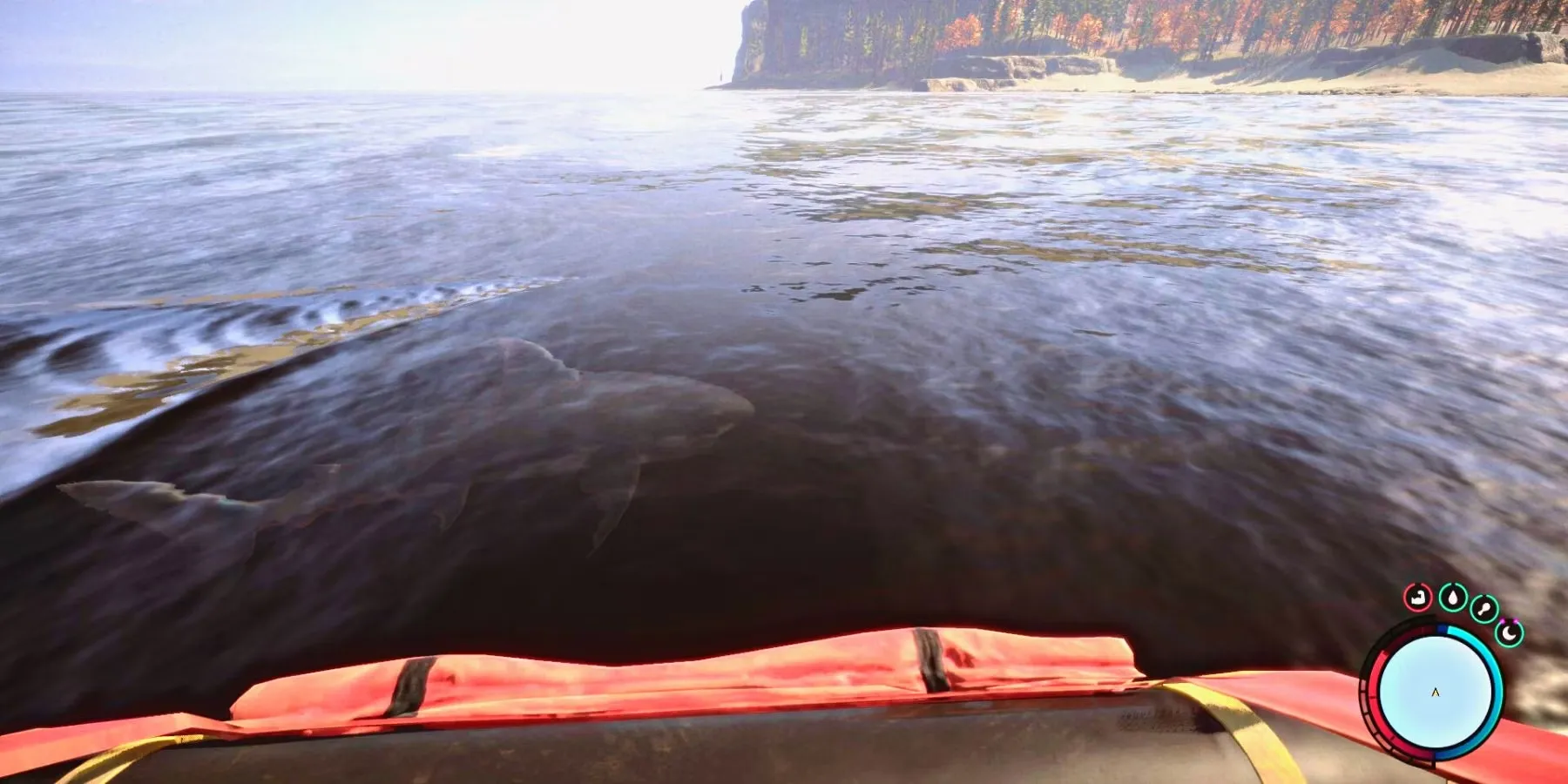 Акула будет кружить вокруг плота некоторое время, и у игроков есть несколько вариантов. Они могут отпугнуть ее, стреляя в нее, или избежать ее, подождав, пока она уплывет. Однако если игроки не будут ждать достаточно долго, есть шанс, что она бросится в погоню и может укусить их. Они должны пережить пару укусов, пока у них есть запас здоровья.