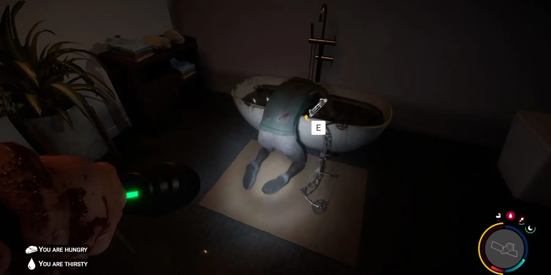 Лестница ведет в темный, затопленный коридор с дверью в затопленную комнату справа. Войдите в комнату, и в задней части будет стол, где можно взять пистолетный подавитель и патроны. Справа от подавителя зайдите за угол и найдите кровать и дверь в ванную комнату. Композитный лук находится в ванной комнате на полу рядом с трупом, лежащим в ванне.