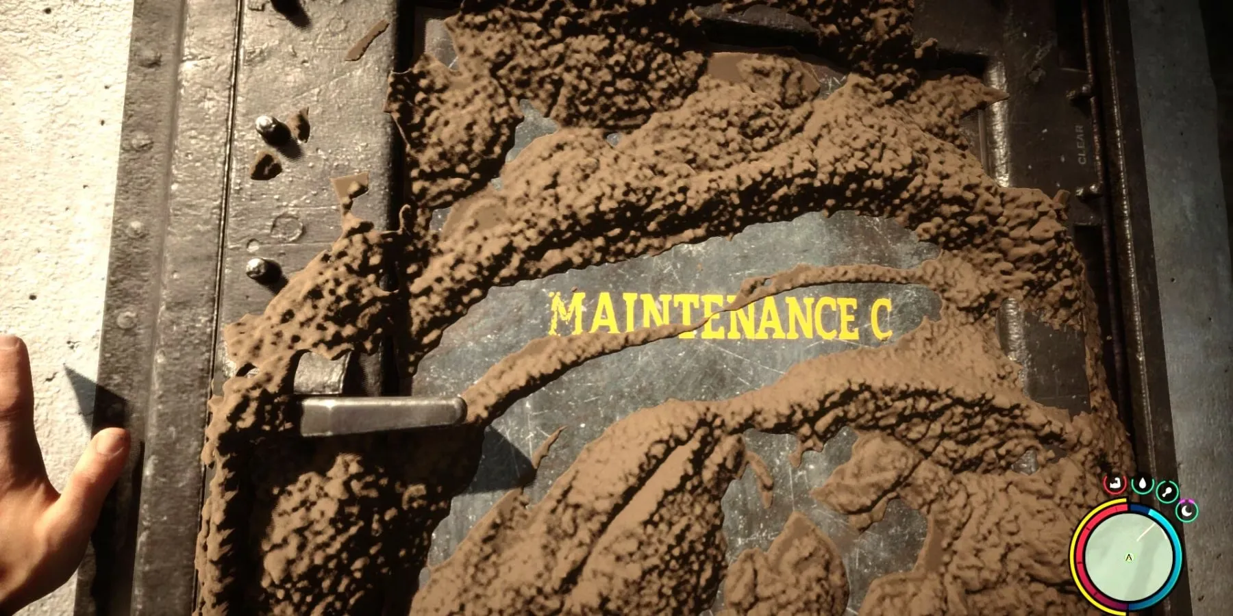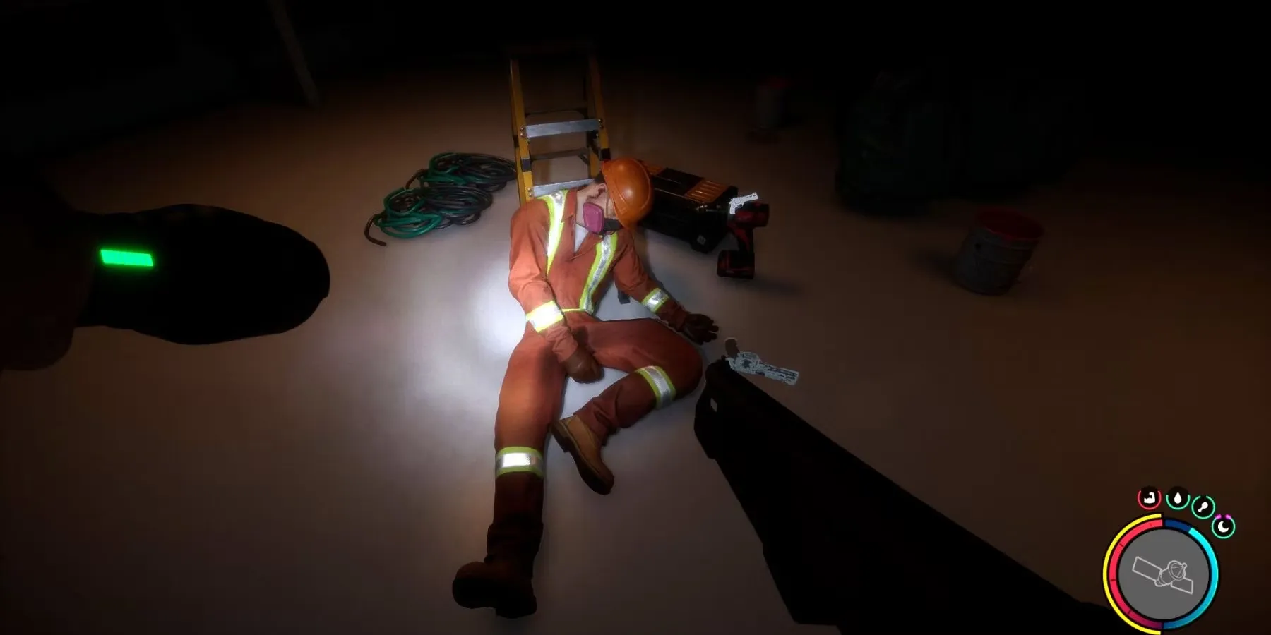 Удерживая клавишу "E", откройте дверь и спуститесь внутрь подземного бункера. Здесь есть длинный коридор с двумя комнатами: одна в конце, а другая в середине коридора справа. Комната в конце - это склад с небольшим количеством ресурсов и припасов. Комната справа не обставлена и находится в середине ремонта. Мертвый рабочий прислонен к лестнице в центре комнаты. Револьвер лежит на полу рядом с ним.