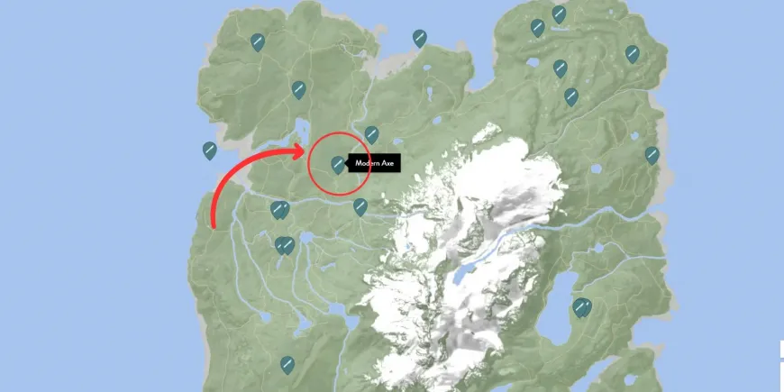 Современный топор находится на северо-западной стороне острова. Для тех, кто пытается достать его из точки спавна, он находится почти в центре, но ближе всего к точке спавна на горе. Чтобы найти его, игроки могут поискать один из фиолетовых маркеров GPS-локатора на карте поблизости.