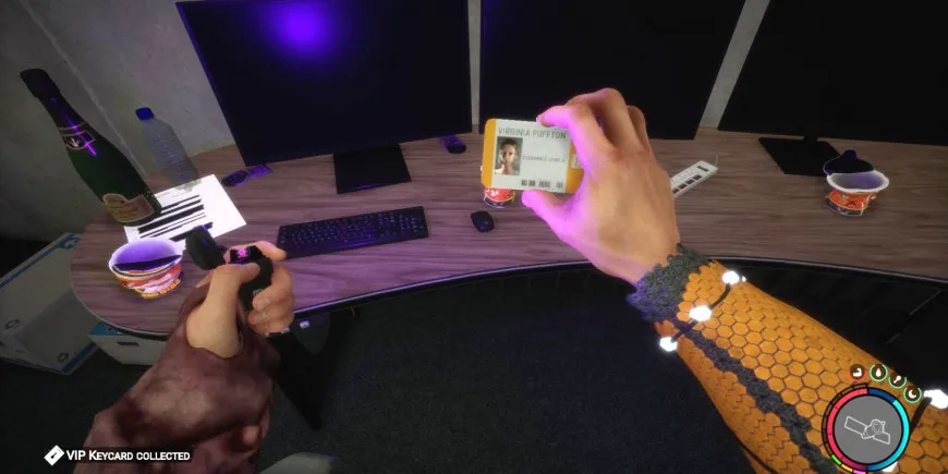 Войдите в дверь и пройдите по коридорам здания до лестницы, выходящей из воды. На вершине лестницы находится офис с несколькими компьютерами, контейнерами для документов и мониторами с записью камер наблюдения. VIP-карточка, принадлежащая Вирджинии Паффтон, лежит на столе под мониторами.
