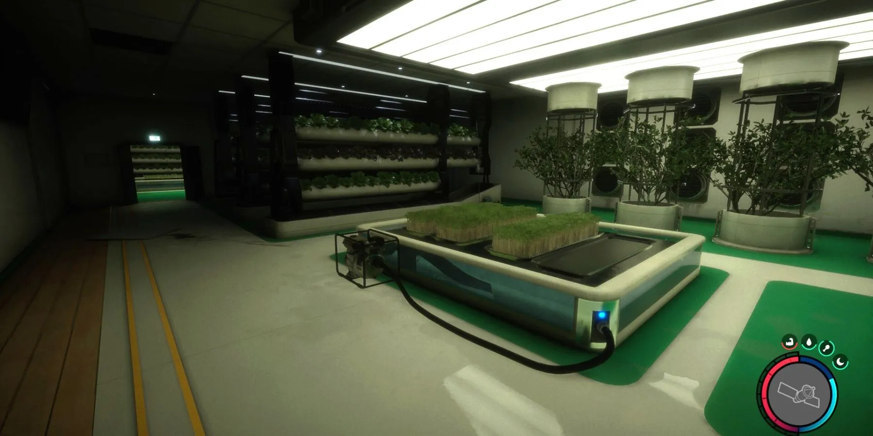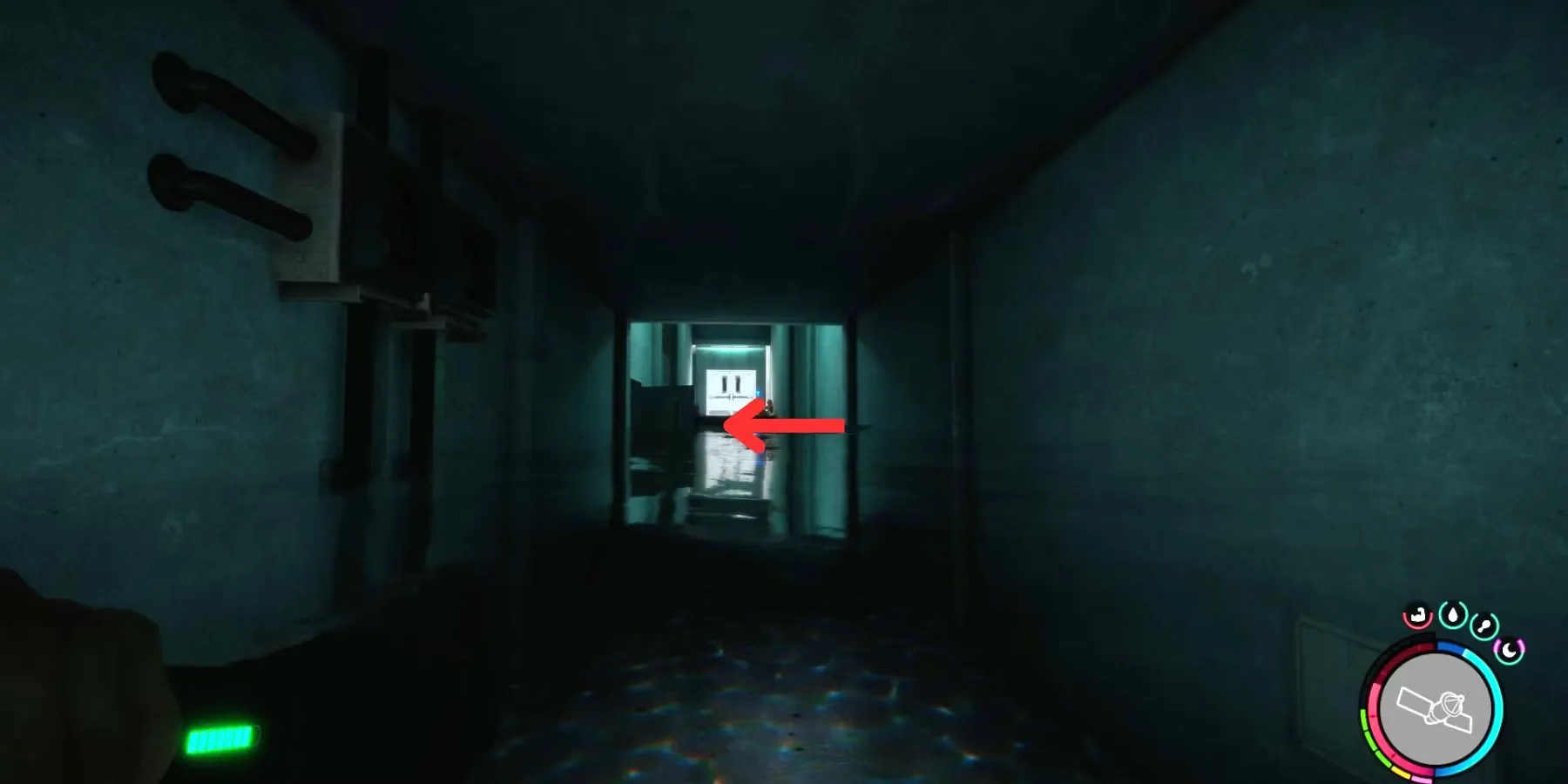 Продолжайте двигаться мимо комнат с гидропонным садом вглубь кухонной зоны; в конце концов, коридор будет затоплен, и игрокам придется проплыть оставшуюся часть пути. Проплыв через последний гидропонный сад, они попадут в коридор с запертыми дверями в конце и открытой дверью слева.