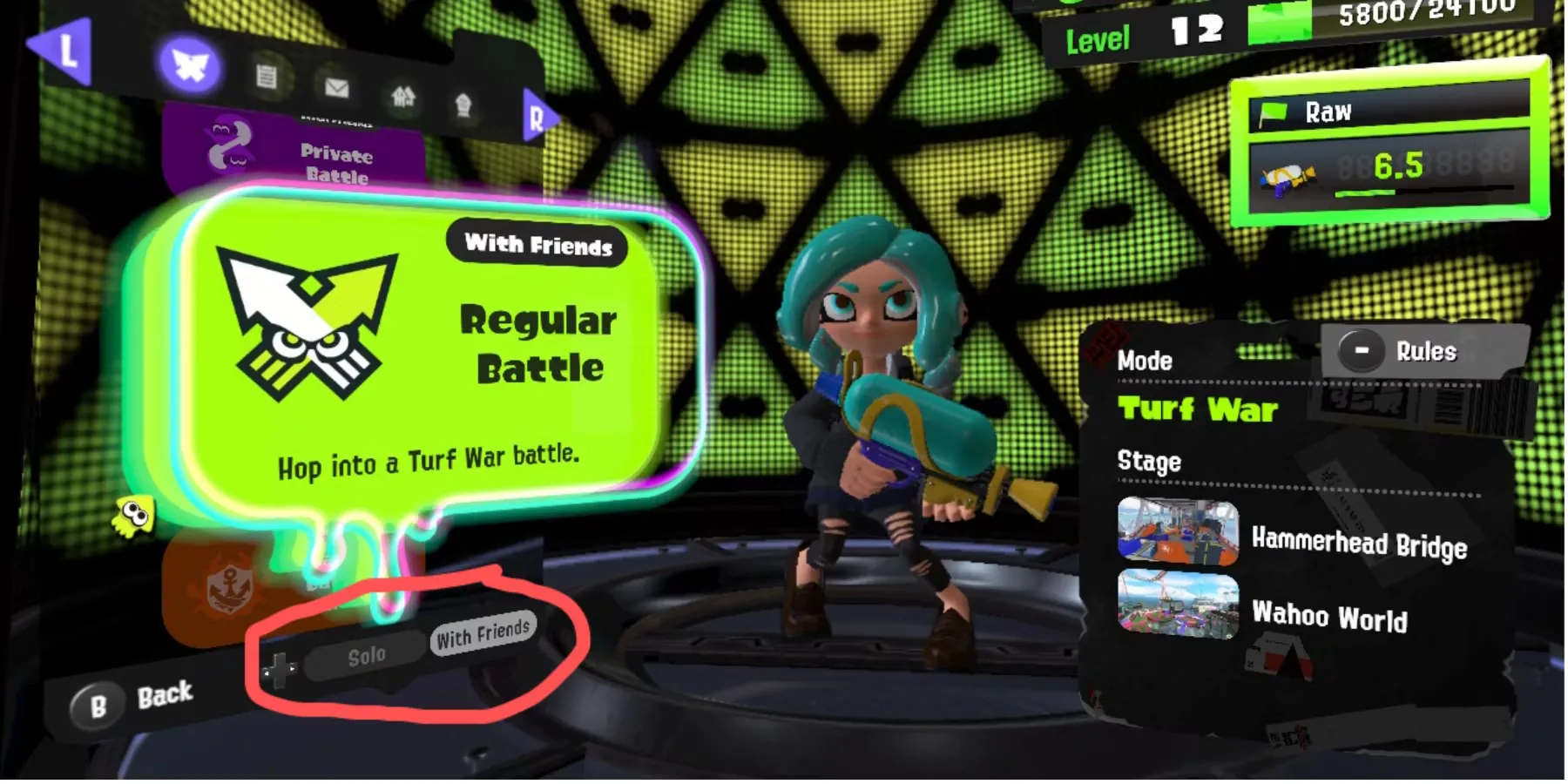 Игра Salmon Run не сильно отличается от Turf Battles. Находясь в меню режиме свободного доступа, нажмите правую кнопку, чтобы переместиться вправо, и в меню должна появиться надпись "с друзьями". И снова, один игрок может сделать комнату, а к нему могут присоединиться до трех других.
