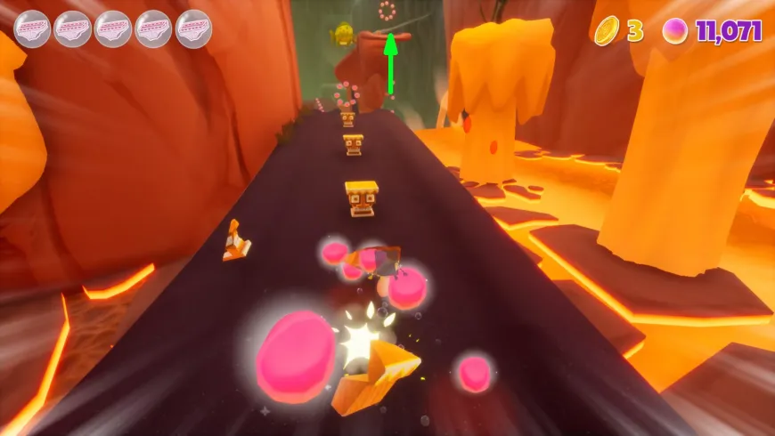Для начала игрокам нужно добраться до второй контрольной точки этапа, Algae Jungle. Затем игрокам, следует пройти по пути желе, чтобы попасть в зону, заполненную лавой. Пройдя эту область, игроки в конце концов окажутся на платформе, изображенной на картинке выше.