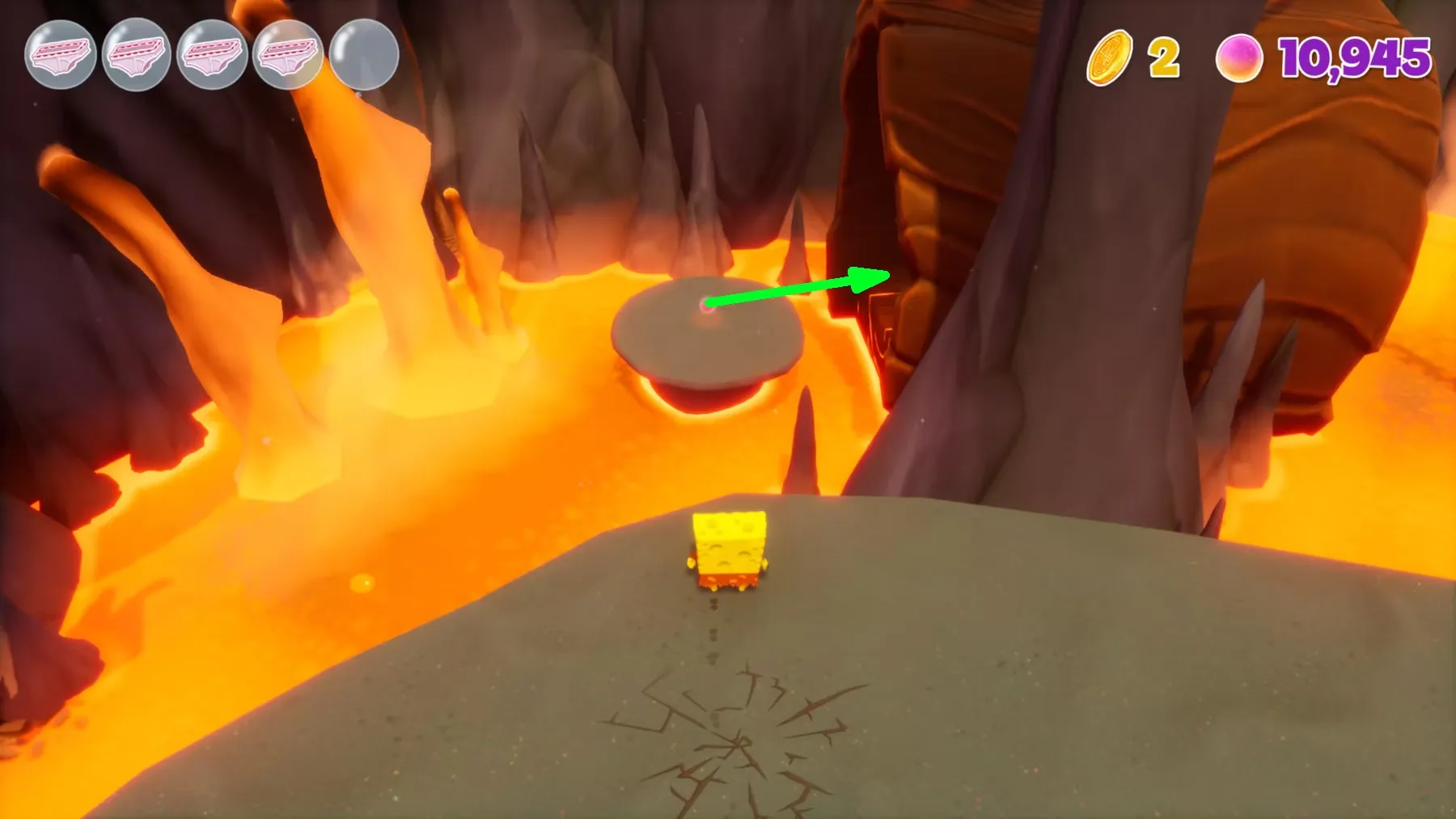 Игрокам теперь следует отправиться на горку Volcano Slide и прокатиться по ней до точки, изображенной на картинке выше. В этом месте горка обрывается, и игроки должны свернуть вправо, чтобы попасть на батут в лаве. Этот батут отправит Губку Боба на возвышенную часть горки, которая ведет прямо к третьему золотому дублону.