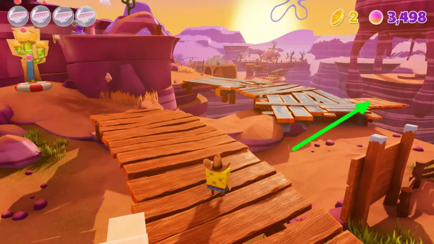 Игроки должны начать с "Тропы медуз", второй контрольной точки в игре Wild West Jellyfish. Достигнув этой контрольной точки, игроки должны просто следовать по желейной тропе, пока не достигнут области, изображенной на картинке выше. Затем игроки должны использовать батуты в правой части этой области, чтобы добраться до фиолетовой кнопки, топнуть по ней, а затем использовать Карате Кик, чтобы пройти через золотые кольца и попасть в битву, в которой будет получен первый золотой дублон.