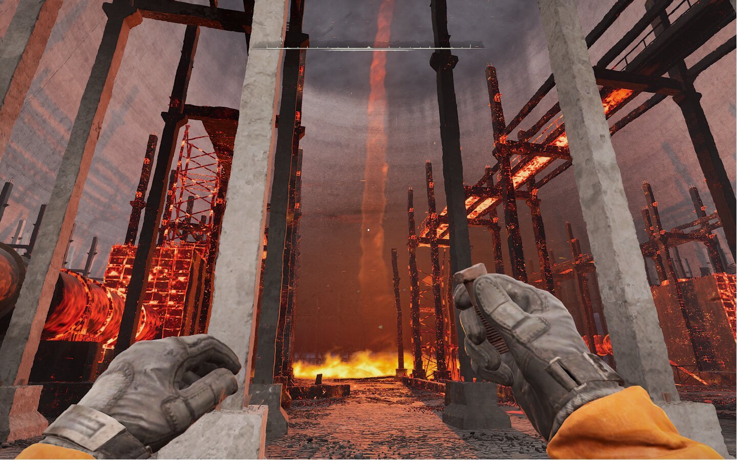 Как раз тайминг нам и предстоит учитывать в попытках преодолеть смерч. Чтобы добраться до артефакт, вам нужно перемещаться по металлическим уступам, которые нагреваются из-за нахождения рядом с раскаленным пламенем. Через каждые 40 секунд та или иная конструкция нагреется, из-за чего вы, если будете стоять на ней, получите постепенный урон.