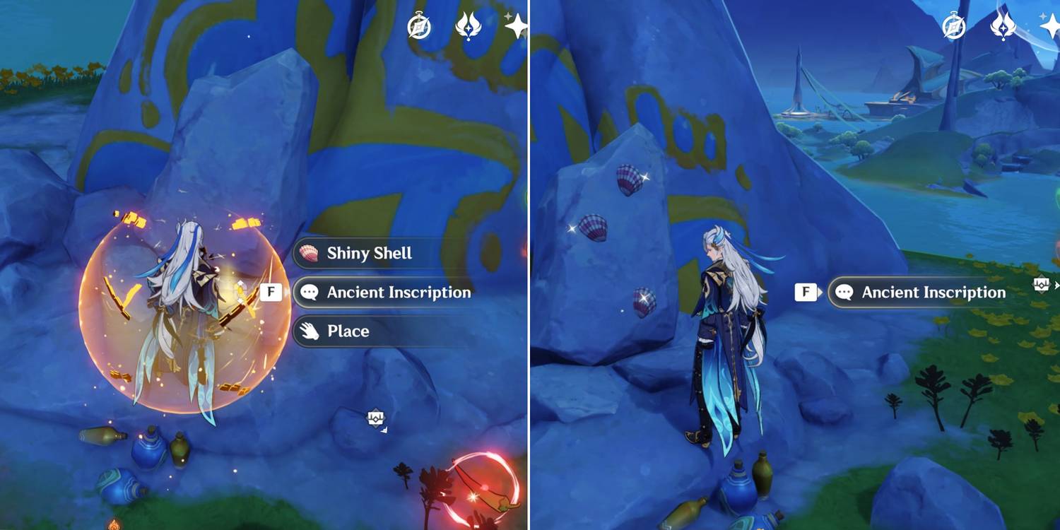 Третья и последняя блестящая ракушка находится на вершине небольшого камня рядом с Древней надписью. Чтобы собрать его: