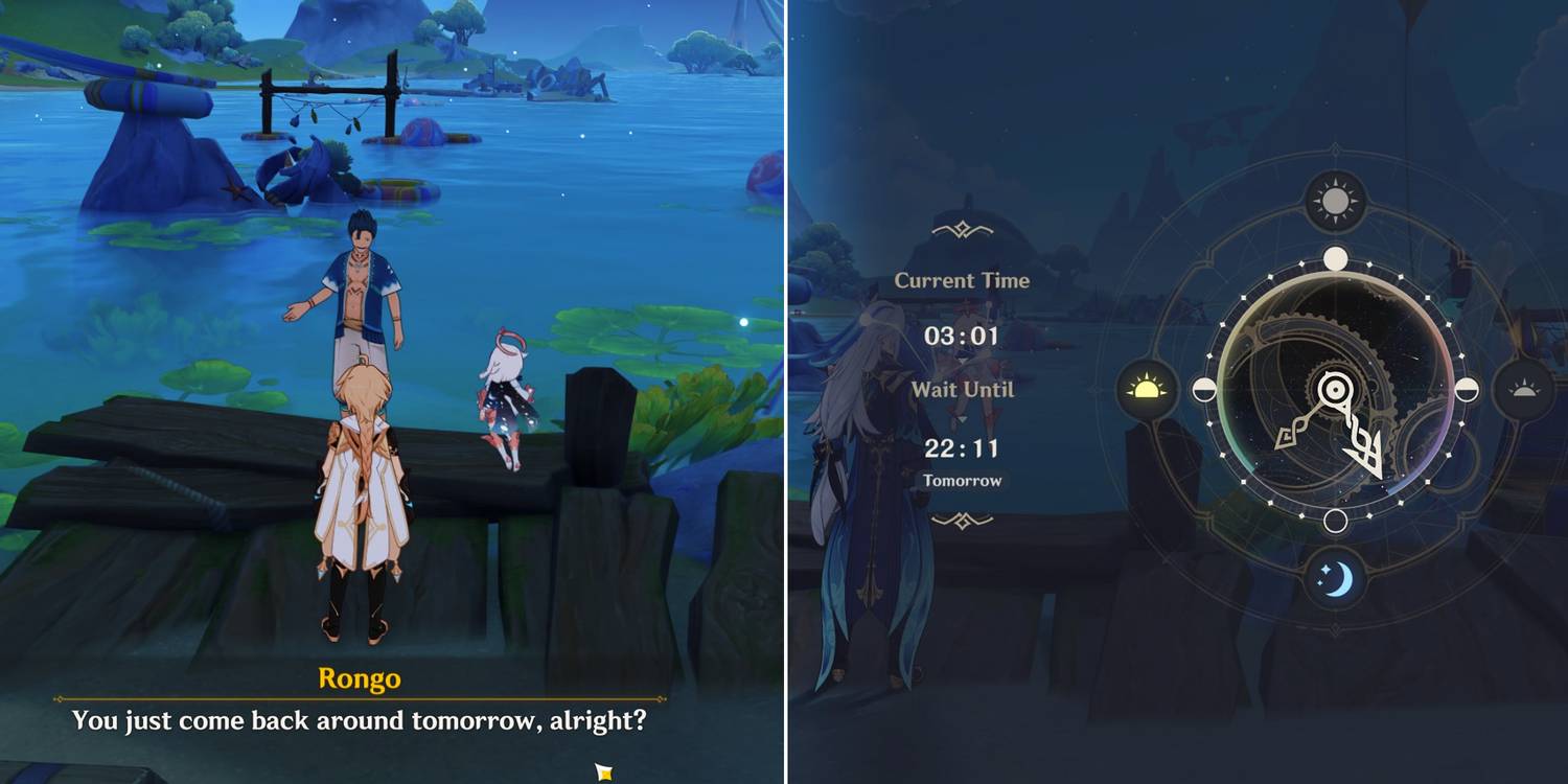 Ронго скажет игрокам подождать до следующего дня. Откройте главное меню и используйте часы, чтобы пройти внутриигровой день. Затем: