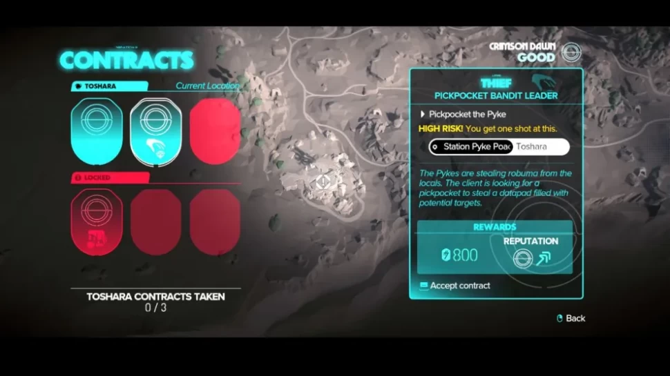 Высокий риск! Контрактные миссии - это также отличный способ быстро заработать кучу репутации. Как видно, это рискованные и высокодоходные контрактные миссии, которые требуют от вас пробраться в закрытые зоны, чтобы украсть документ или подбросить интересный объект. Некоторые миссии в середине и конце игры включают уничтожение и разграбление пиратских кораблей на орбитах.