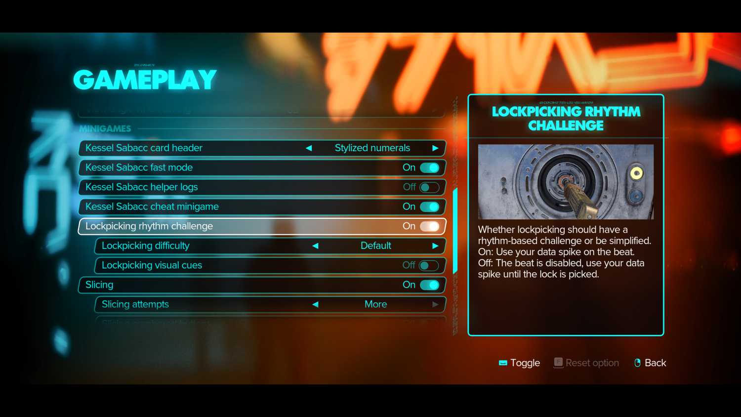 Игрокам, которые испытывают трудности с таймингом, повезло: в Star Wars Outlaws есть широкий выбор опций доступности, несколько из которых относятся к мини-игре «Взлом замков». Опция сложности взлома замков позволяет упростить использование шипа данных, а включение визуальных подсказок также может существенно помочь. Кроме того, игроки могут просто отключить задание ритма во взломе замков, и в этом случае им больше не придется следовать ритму при использовании шипа данных.