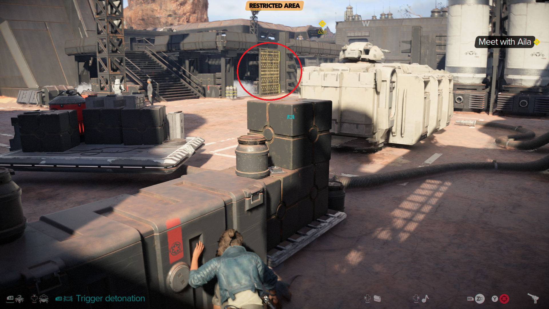 Если вы хотите справиться со всеми тайком, используйте Никса, чтобы отвлечь охранников, и взорвите несколько контейнеров, чтобы разделить штурмовиков и заставить их подойти ближе к высокой траве неподалеку. Здесь вы сможете убивать их по одному.