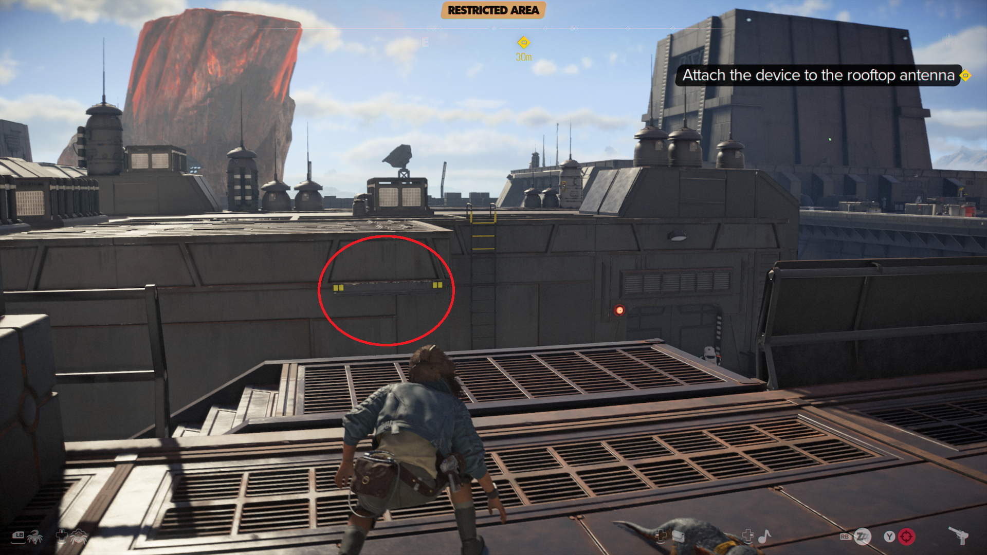 После этого вам останется только взломать запертую дверь с помощью шипа Данных, и вы наконец-то сможете найти Эйлу. Ей нужно попасть на крышу, чтобы прикрепить устройство к антенне. Сюда можно подняться несколькими путями, которые предполагают сражение со штурмовиками, но вы также можете пройти по лестнице за зданием Эйлы к внешней стене, а затем перепрыгнуть на уступ с желтыми метками так, чтобы вас никто не увидел.