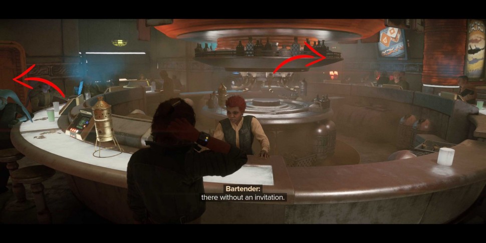 Еще одно нажатие кнопки R3 активирует турболифт, который поднимет игроков на этаж, где находятся апартаменты Горака. Там будет показана короткая сцена, после чего игроков вернут в кантину, где Никс расскажет, что украл кольцо Горака. Кольцо Горака можно продать, чтобы заработать немного легких кредитов, но игроки, скорее всего, захотят придержать его, так как возвращение кольца Гораку в дальнейшем улучшит отношения Кей с Пайками.