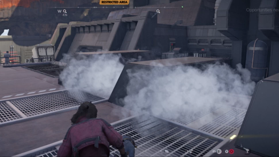 Пройдите по нему и направьтесь вправо, где вы увидите двух охранников впереди и одного, охраняющего хранилище внизу. Присядьте под паром из вентиляционных отверстий и наблюдайте. Двое охранников наверху заняты разговором, поэтому у вас есть шанс спуститься к одинокому охраннику внизу. Используйте бластер, чтобы успокоить одинокого охранника, что даст вам возможность быстро открыть хранилище и проникнуть внутрь, пока никто не заметил.