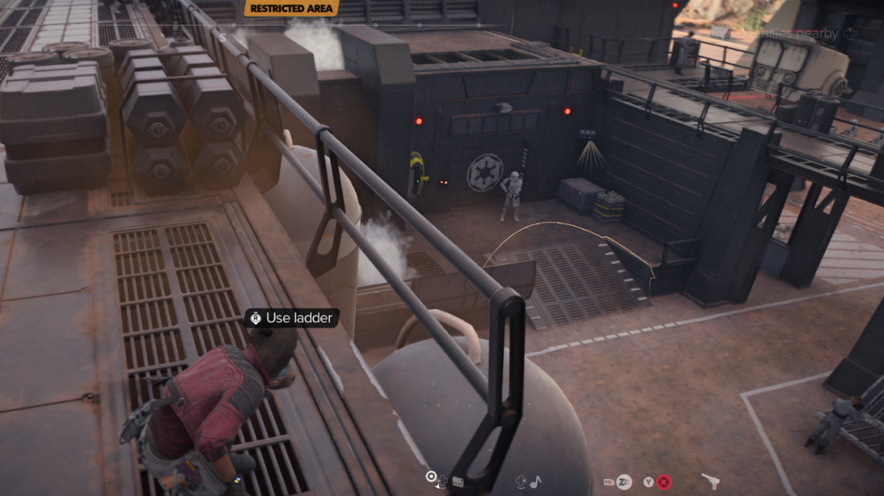 Пройдите по нему и направьтесь вправо, где вы увидите двух охранников впереди и одного, охраняющего хранилище внизу. Присядьте под паром из вентиляционных отверстий и наблюдайте. Двое охранников наверху заняты разговором, поэтому у вас есть шанс спуститься к одинокому охраннику внизу. Используйте бластер, чтобы успокоить одинокого охранника, что даст вам возможность быстро открыть хранилище и проникнуть внутрь, пока никто не заметил.