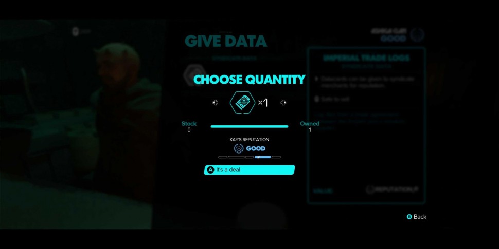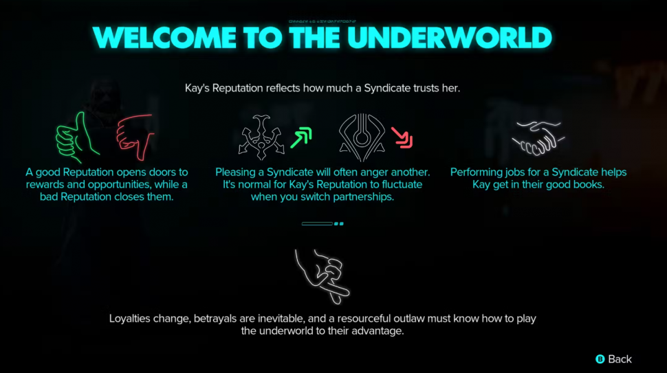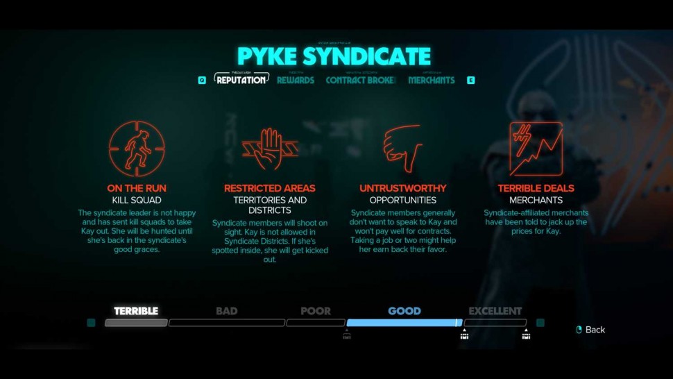 Существует множество способов улучшить отношения Кей с преступным синдикатом, хотя некоторые из них, пожалуй, намного лучше других. Например, во время прохождения нескольких сюжетных миссий игрокам будет предложено встать на сторону одного преступного синдиката, а не другого, в результате чего отношения Кей с одной фракцией улучшатся за счет другой. Если же игроки отдадут данные Империи или Синдиката торговцу одной из фракций, они смогут повысить свою репутацию в этой фракции, не испортив отношения с другой.
