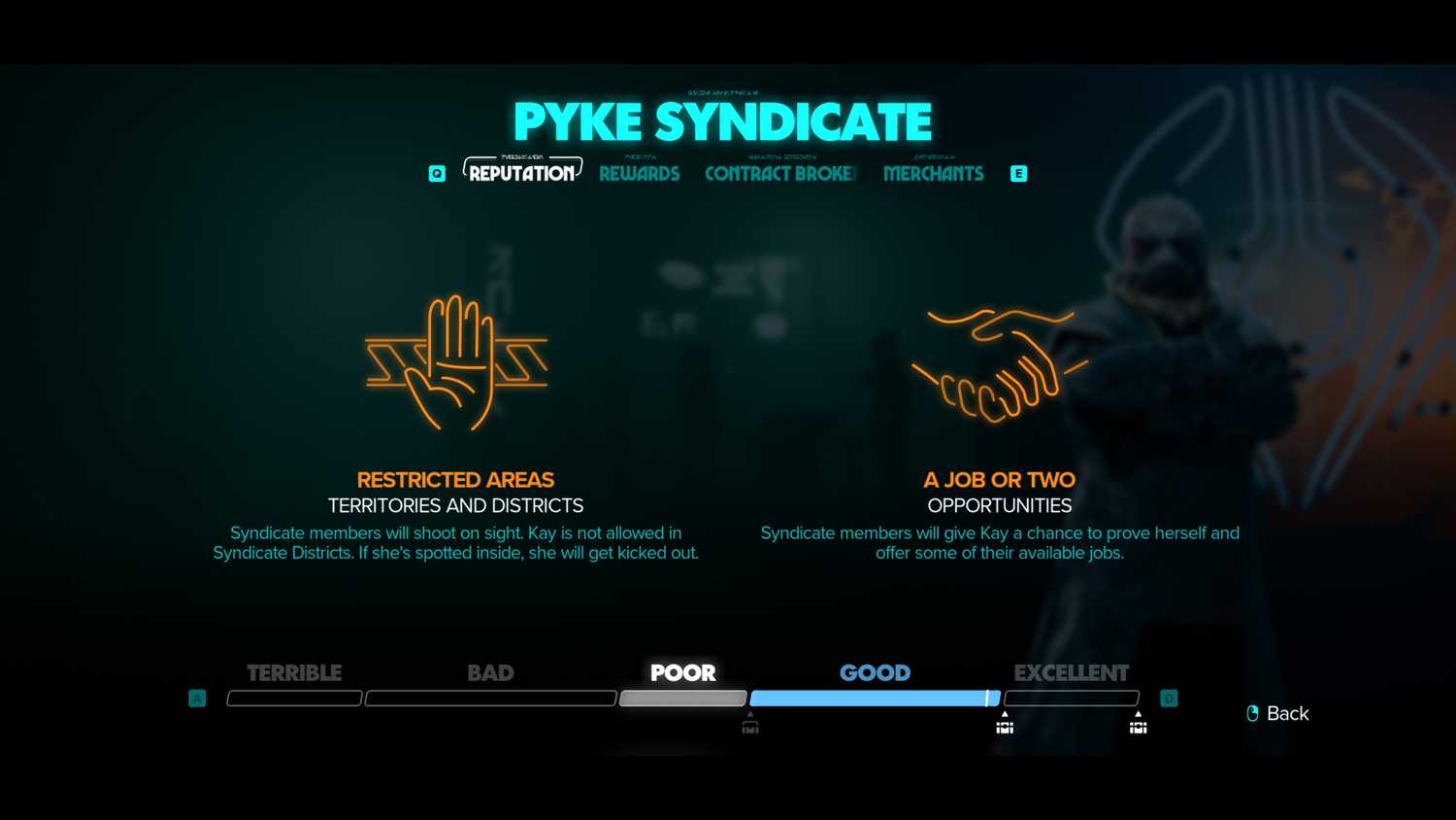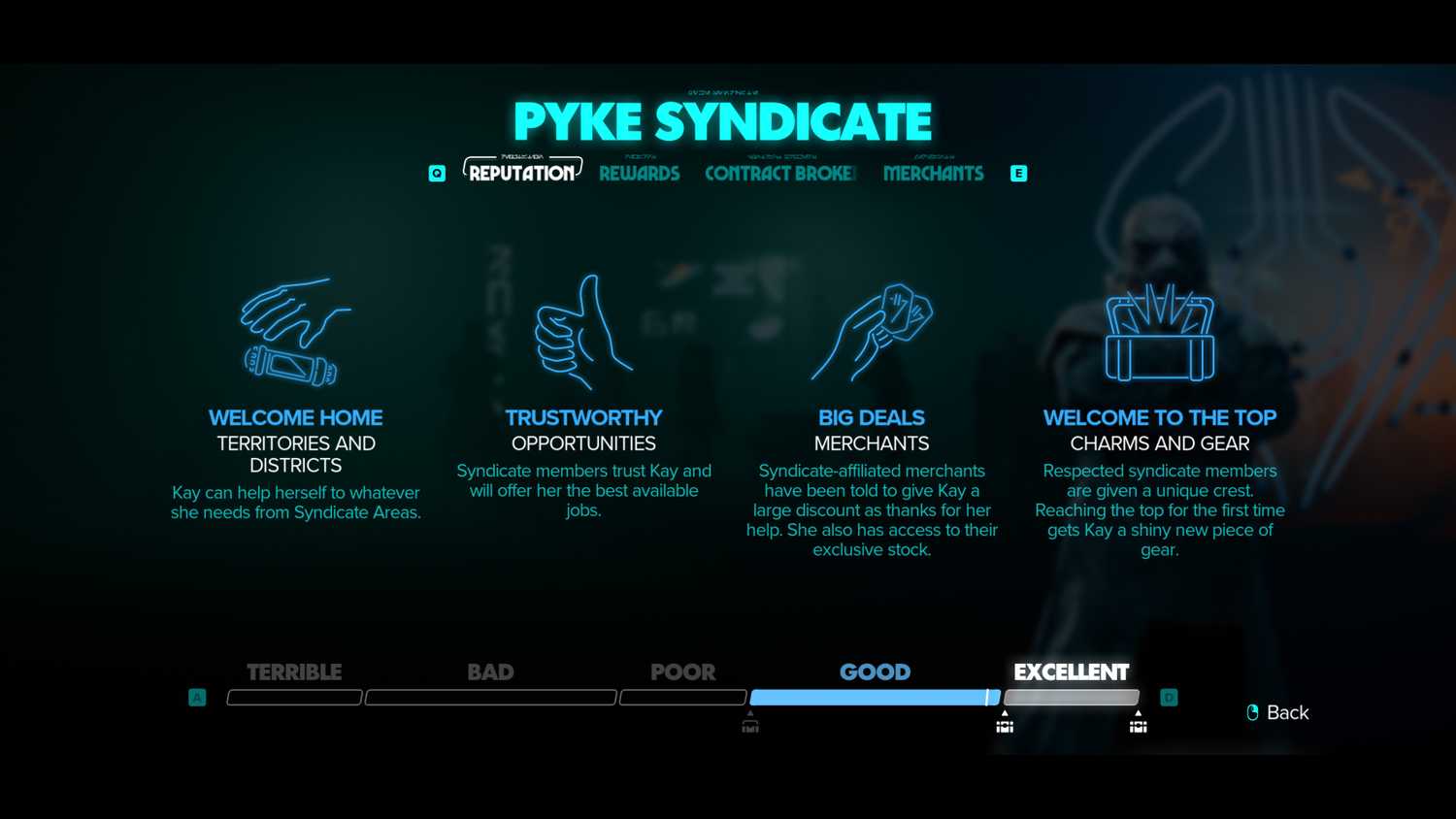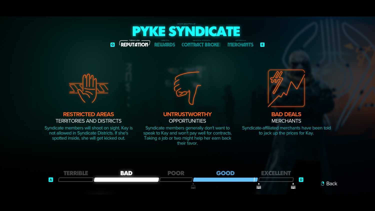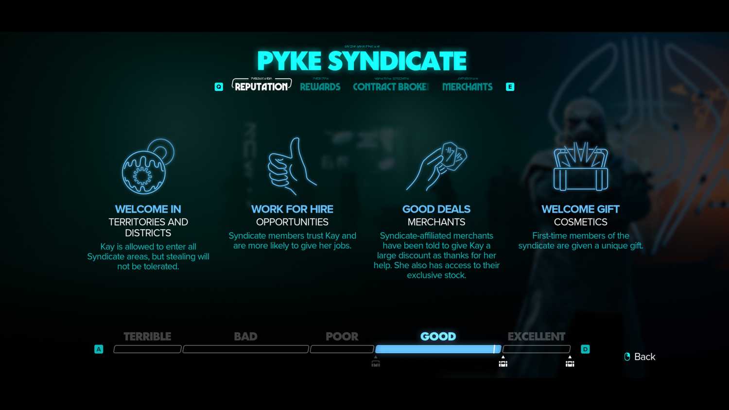 Существует множество способов улучшить отношения Кей с преступным синдикатом, хотя некоторые из них, пожалуй, намного лучше других. Например, во время прохождения нескольких сюжетных миссий игрокам будет предложено встать на сторону одного преступного синдиката, а не другого, в результате чего отношения Кей с одной фракцией улучшатся за счет другой. Если же игроки отдадут данные Империи или Синдиката торговцу одной из фракций, они смогут повысить свою репутацию в этой фракции, не испортив отношения с другой.