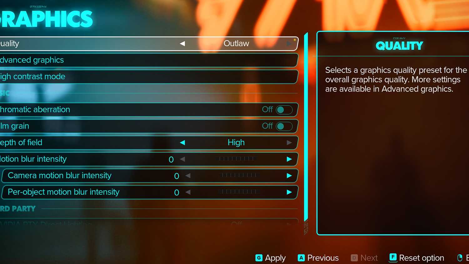 - Выберите предустановку графики «Outlaw»: Используйте опцию «Качество», чтобы выбрать «Outlaw».