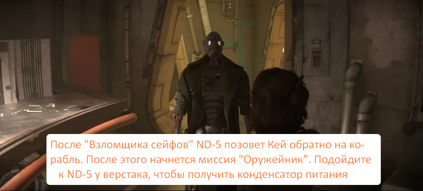 Выполнение первого задания квестовой линии приведет к тому, что Кей придется принять непростое решение: остаться и помочь Анку или поискать другого взломщика. Это положит начало миссии «Прорыв», куда вам нужно будет попасть, чтобы получить энергетический модуль. После «Взломщика сейфов» ND-5 позвонит Кей и попросит ее вернуться на корабль. Это начнет небольшой квест «Оружейник».