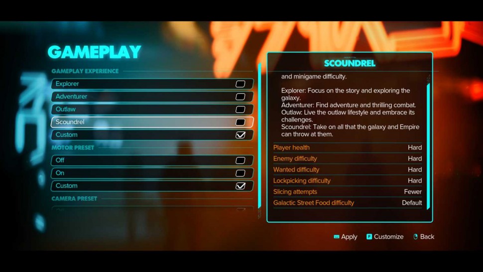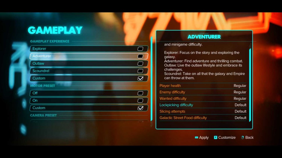 В Star Wars Outlaws четыре основные настройки сложности: «Исследователь», «Искатель приключений», «Вне закона» и «Подлец». Каждая из них фактически служит набором предустановок, определяющих здоровье игрока, сложность противника и сложность розысков. Игроки могут придерживаться предложенных пресетов или настроить сложность под себя, что может оказаться полезным, если они преуспевают в одной области игры, но испытывают трудности в другой.