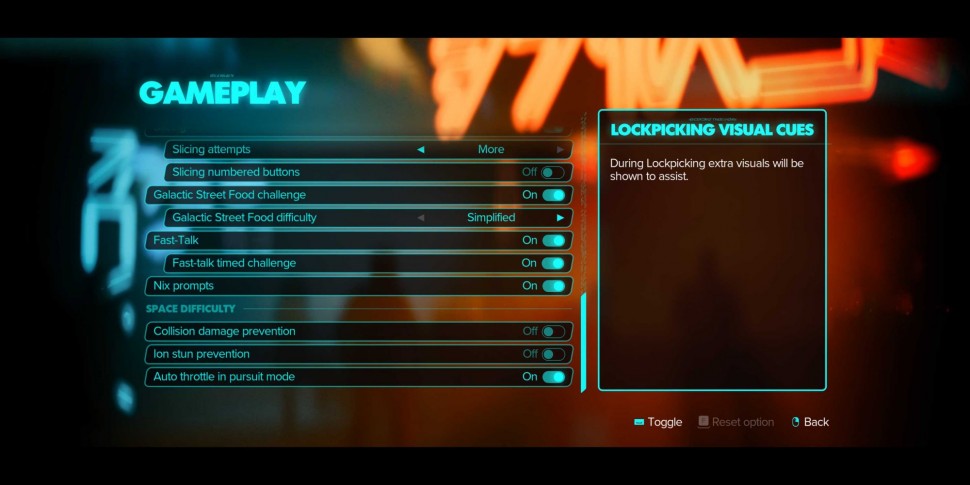Вышеупомянутые настройки сложности определяют здоровье игрока, сложность врагов, сложность розысков, сложность взлома замков, попытки нарезки и сложность галактической уличной еды. Однако в Star Wars Outlaws есть и множество других настроек сложности и доступности. Большинство из них связано с мини-играми, но игроки также могут облегчить космические путешествия и собачьи бои: в меню Gameplay есть опции предотвращения повреждений при столкновении, предотвращения ионного оглушения и автоматического дросселирования в режиме преследования.