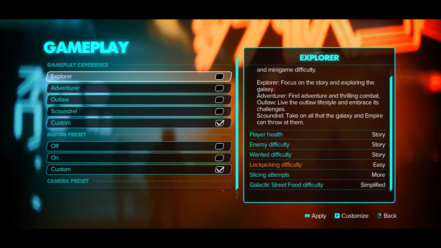 Вышеупомянутые настройки сложности определяют здоровье игрока, сложность врагов, сложность розысков, сложность взлома замков, попытки нарезки и сложность галактической уличной еды. Однако в Star Wars Outlaws есть и множество других настроек сложности и доступности. Большинство из них связано с мини-играми, но игроки также могут облегчить космические путешествия и собачьи бои: в меню Gameplay есть опции предотвращения повреждений при столкновении, предотвращения ионного оглушения и автоматического дросселирования в режиме преследования.