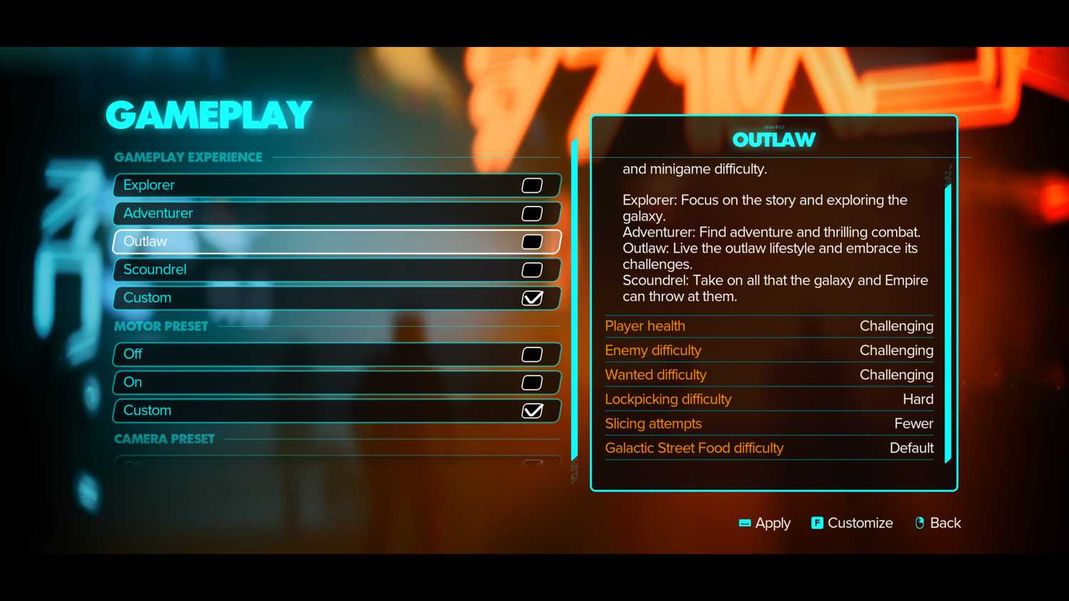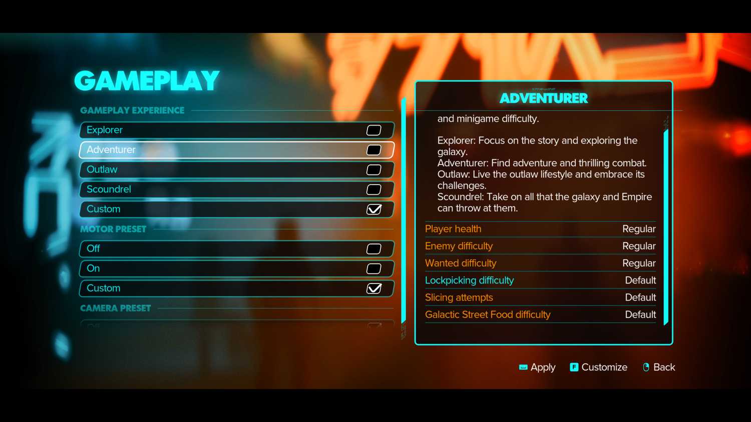 В Star Wars Outlaws четыре основные настройки сложности: «Исследователь», «Искатель приключений», «Вне закона» и «Подлец». Каждая из них фактически служит набором предустановок, определяющих здоровье игрока, сложность противника и сложность розысков. Игроки могут придерживаться предложенных пресетов или настроить сложность под себя, что может оказаться полезным, если они преуспевают в одной области игры, но испытывают трудности в другой.