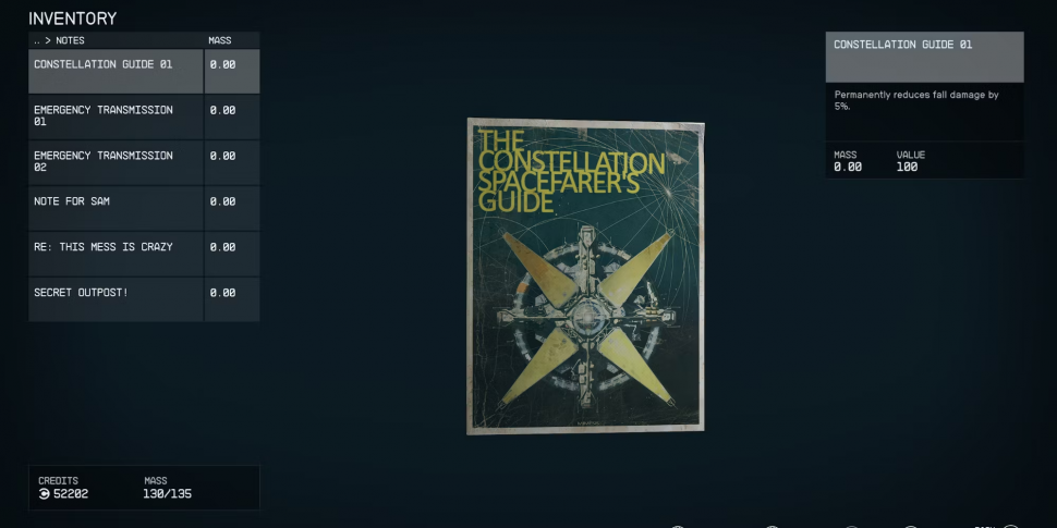 Игроки также могут заработать снаряжение и другие предметы, уменьшающие урон от падения. Записка "Путеводитель по созвездиям" 01 постоянно снижает урон от падения на 5%, ее можно найти при первом посещении Ложи: она будет лежать на столе перед витриной артефактов.