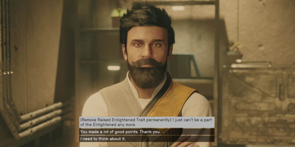 Для того чтобы снять черту "Вознесенный Просветленный", игроку нужно просто поговорить с Энди Сингхом и выбрать опцию "[Вознесенный Просветленный] Я не уверен, что хочу больше быть частью Просветленных". Он попытается отговорить игрока от ухода, но после еще нескольких реплик диалога у него появится возможность выбрать опцию "[Убрать навсегда черту Raised Enlightened] Я просто не могу больше быть частью Просветленных", чтобы навсегда убрать эту черту.