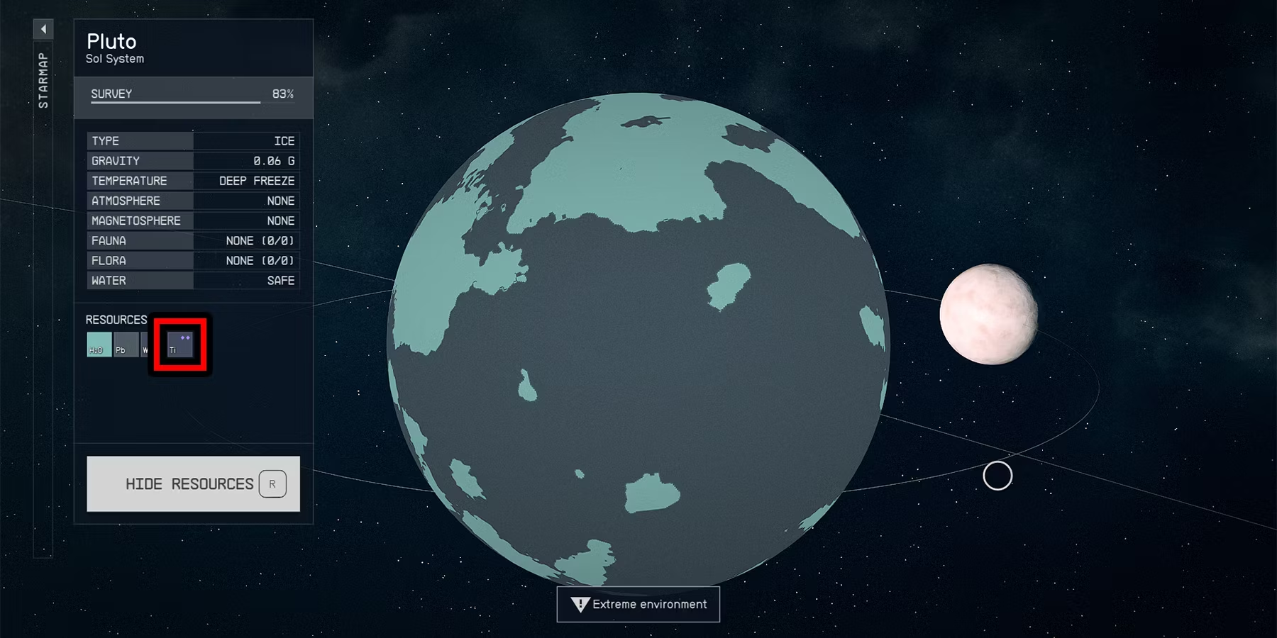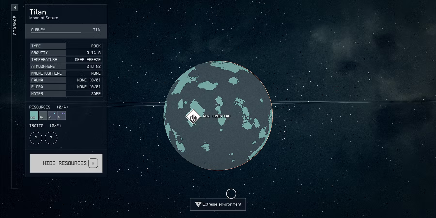 К сожалению, планет, содержащих титан, не так много, поскольку это редкий ресурс. Чтобы узнать, какие ресурсы есть на планете, просканируйте ее и посмотрите в левый нижний угол, чтобы найти все доступные материалы, представленные их химическим символом. В случае с титаном это Ti.