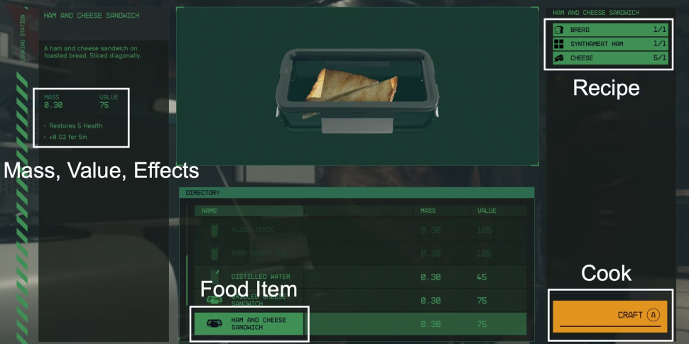 Нажмите A, чтобы создать предмет, а затем найдите его в инвентаре в разделе "Помощь", чтобы получить эффект. Эффекты от этих продуктов могут показаться опытным игрокам тривиальными, но важно помнить, что этот рецепт доступен с самого начала игры Starfield. Более вкусные блюда станут доступны на протяжении всей игры.