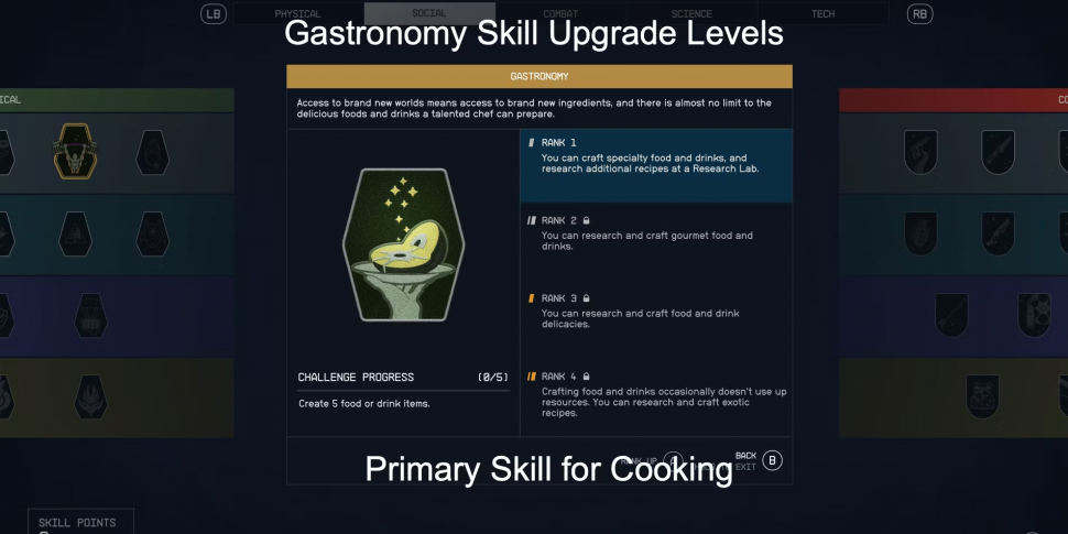 Что касается кулинарии, то основным навыком, в который игроки захотят вложить средства, будет Гастрономия. Каждый уровень этого навыка открывает возможность исследовать продукты питания более высокого уровня. На втором уровне можно будет исследовать и готовить изысканные блюда, а на третьем - деликатесы.