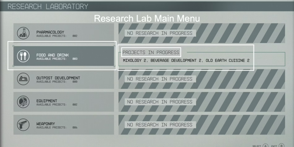 Исследования - это общий термин для всех работ, выполняемых на любой исследовательской станции в Звездном поле. На этой станции игроки вкладывают материалы в проекты, которые открывают возможность создания ремесел на различных станциях. В данном случае игроки хотят посетить раздел "Еда и напитки".